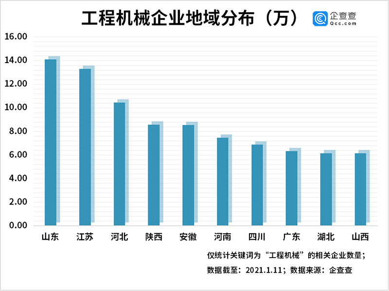 2020年,工程機械迎來行業順周期。在“新基建”等東風的催動下,三一重工、中聯重科、恒立液壓等龍頭企業業績飄紅。企查查數據顯示,目前我國共有157.74萬家工程機械相關企業,山東以14.11萬家企業排名第一,江蘇、河北分列二